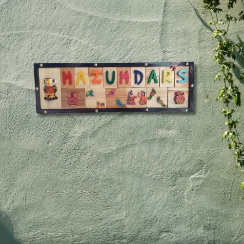 Add a splash of color and creativity to your entrance with this playful, handcrafted wooden nameplate made from premium teak wood. Designed with individually colored letters and charming miniature motifs like owls, birds, and traditional art forms, this piece brings warmth, personality, and a touch of whimsy to your doorway.